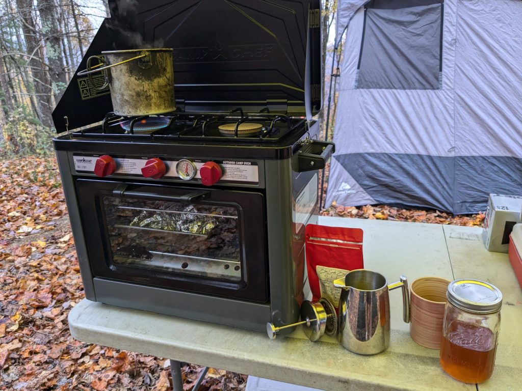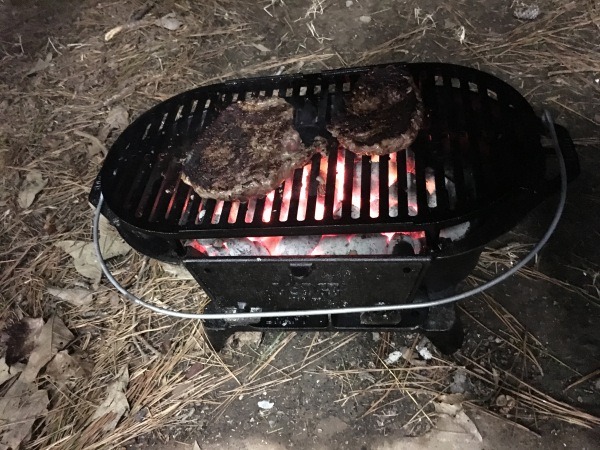 The downside to a Coleman stove is you don’t get the smoky taste from the fire or charcoal. On the other hand, even though there is no smoky flavor, everything tastes better in the woods!