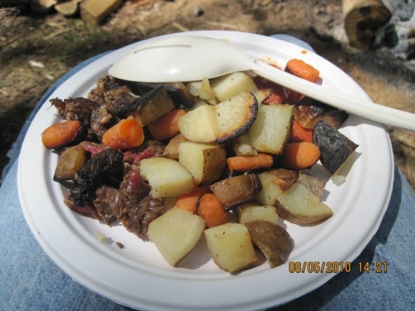 We also have had success with Hobo Meals, where you place cut up steak or a formed hamburger, along with carrots, potatoes, onions, then wrap all the food in a tin foil pouch, use heavy duty foil and consider double wrapping as you’ll be flipping the pouch over and over as it cooks. You can add butter or oil and some seasoning depending on your taste. Now, based on how long you want to cook these and how you want your meat to come out, you may need to blanch the potatoes ahead of time, or perhaps cut them into smaller pieces. I have a friend who had Hobo Meals as a child and her mother used canned potatoes, that way everything would cook evenly. Do whatever works for you. When we make them, we store them in Ziploc bags, because anything you put in the cooler may end up underwater, so you want to keep everything as water-resistant as possible. Also, you’re not spreading the juices from uncooked meat into everything else in the cooler. So, the hobo meals are easy. You throw them on the fire in a fairly warm spot, and then you wait. Forty-five minutes later, you have dinner. Open those up and you’ve got this nice mixture.