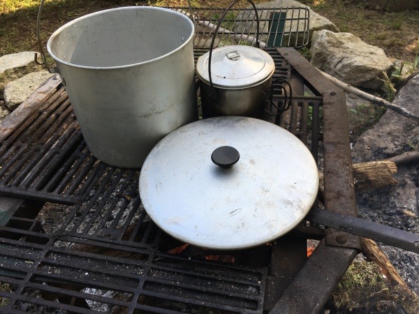 Plan for cleanup before you even begin cooking. Once the fire is going, get your big pot and start warming the water. The pot should be about twelve inches in diameter and about a foot tall. So, the whole time you’re cooking you’re also warming your water. That way, after you’re done eating, then you can immediately wash dishes. You don’t have to wait thirty minutes for hot water and during that time everybody loses interest in cleaning up. Another win-win.
